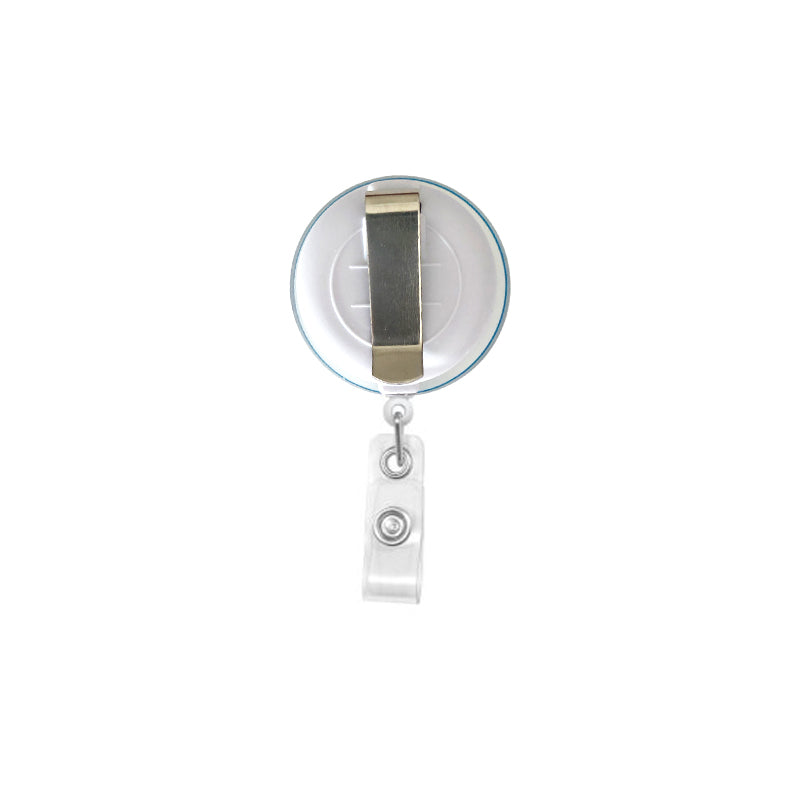 1.5″ width in diameter (Acrylic Face) on a white or clear plastic standard badge reel clip and nylon cable.